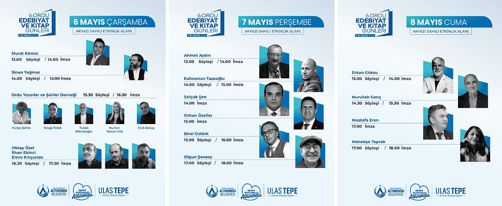 1 Mayıs Emek ve Dayanışma Günü’ne denk gelen açılış etkinliği, Ordu Kültür Sanat Merkezi’nde saat 15’te DİSK Genel Başkanlığı ve milletvekilliği görevlerinde bulunan Süleyman Çelebi’nin “1 Mayısların Anlamı” adlı söyleşisiyle başlayacak. Ardından saat 16.00’da edebiyatın usta kalemi Ahmet Ümit, “Antik Cinayetler” adlı söyleşisiyle sevenleriyle buluşacak. 10 gün sürecek etkinliklerde Buket Uzuner, Pelin Batu, Cem Seymen, Işıl Işık, İnci Aral, Sinan Yağmur, Kahraman Tazeoğlu, Nurullah Genç, Adora Yağmur, Beyza Alkoç ve Hatice Kübra Tongar başta olmak üzere onlarca yazar, 6. Ordu Edebiyat ve Kitap Günleri’ne renk katacak. Etkinliğe dair tüm detaylar ve güncellemeler https://edebiyatvekitapgunleri.altinordu.bel.tr adresi üzerinden takip edilebilecek.